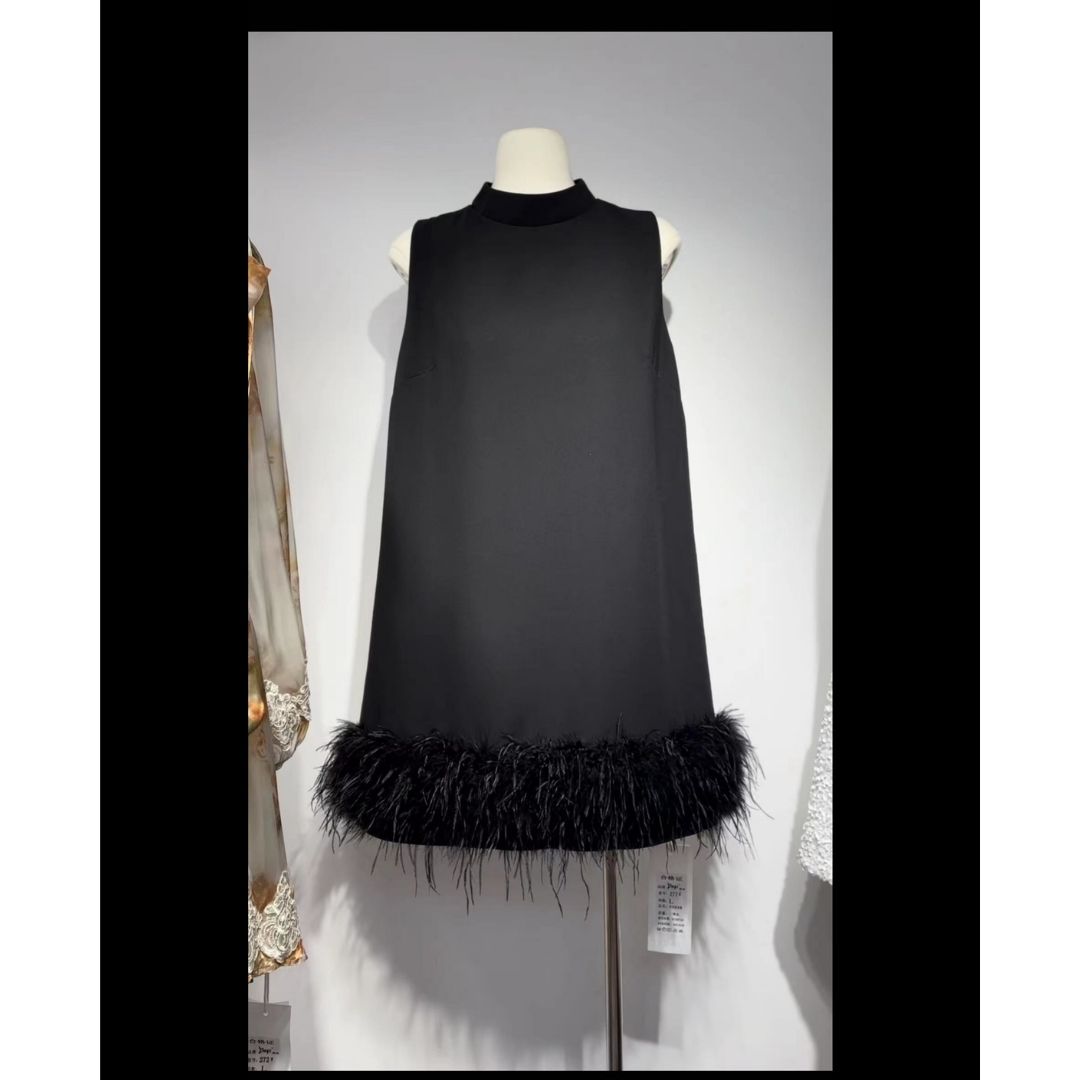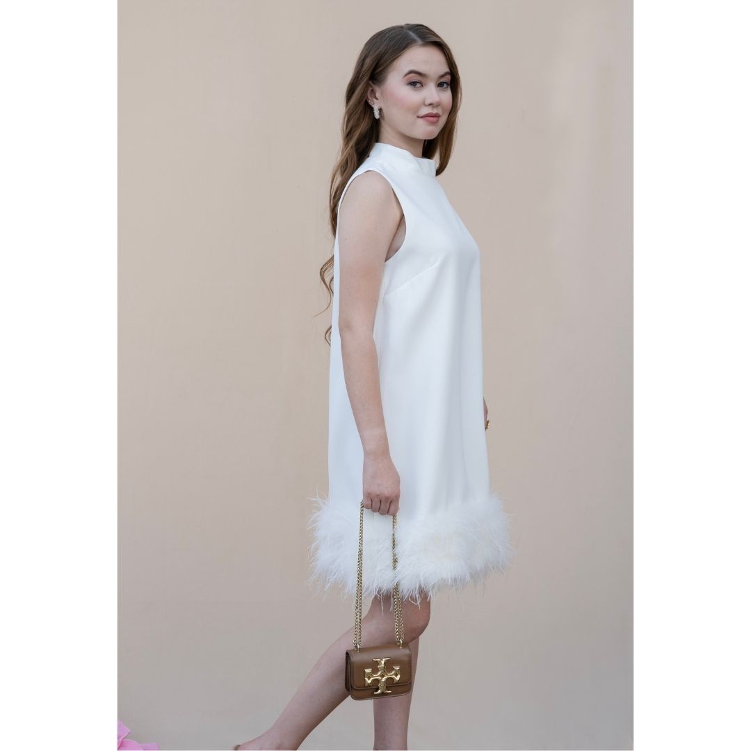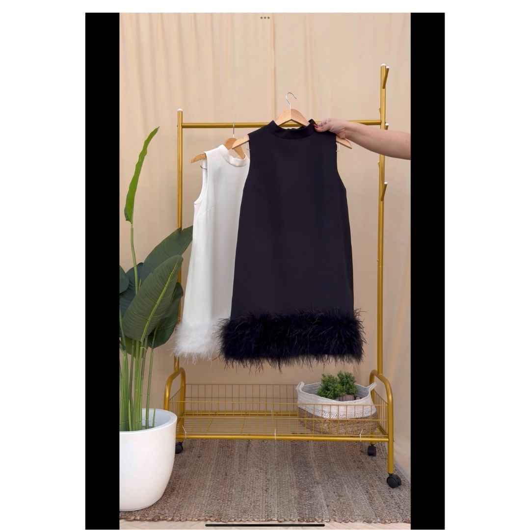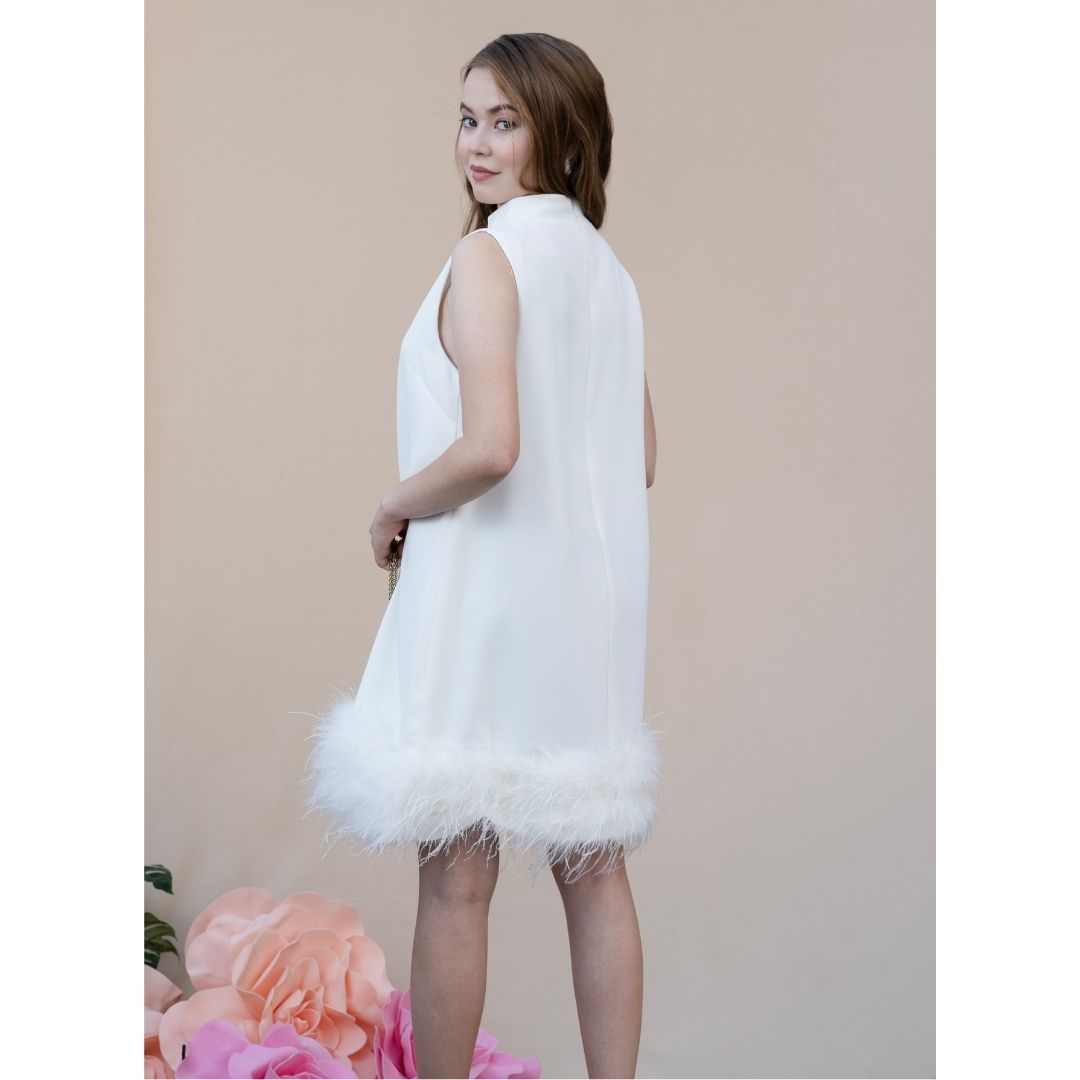 Elevate your elegance with this Designer Dress, crafted in a sleek shift silhouette and finished with soft feather detailing at the hem. Sleeveless and effortlessly graceful, it’s perfect for cocktail soirées, bridal events, or any occasion that calls for a touch of glam.