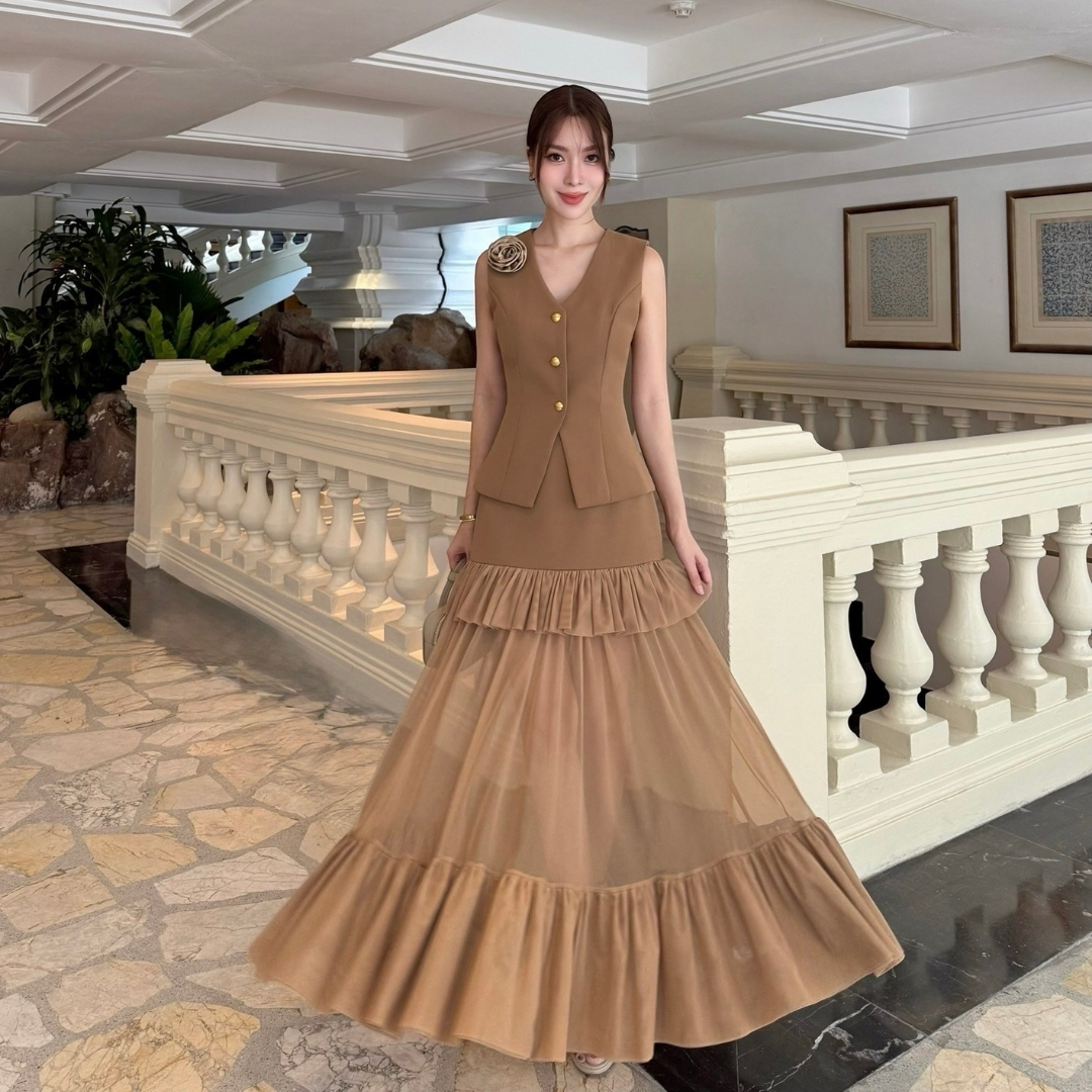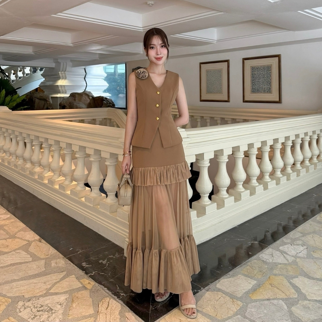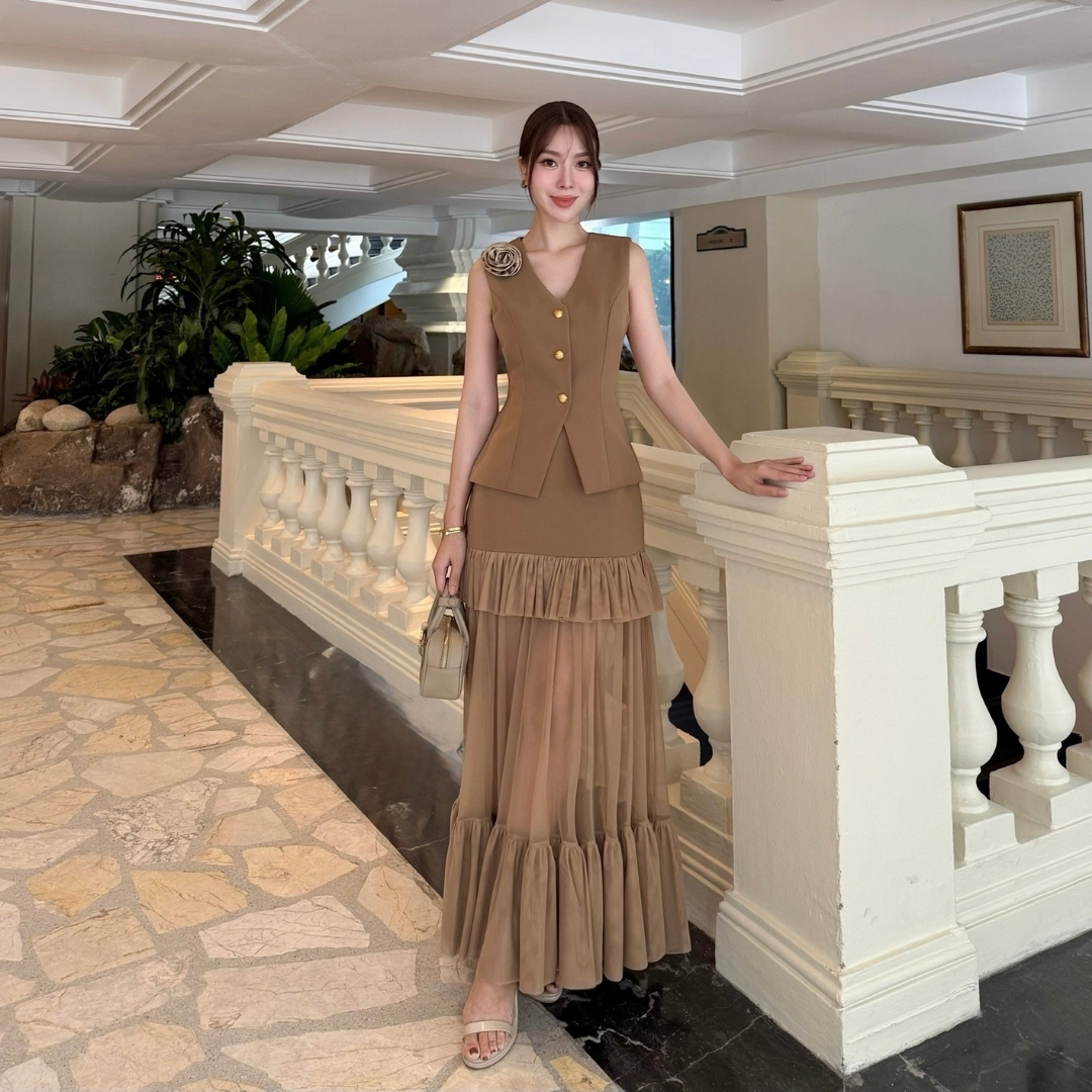 Grace meets sophistication in the Floral Layer Skirt Set, designed for the modern woman who embraces timeless style. The structured sleeveless top with gold button accents and floral brooch detail pairs beautifully with the soft, layered skirt — creating a fluid yet refined silhouette. Ideal for brunches, soirées, or elegant gatherings, this ensemble exudes understated luxury with every step.