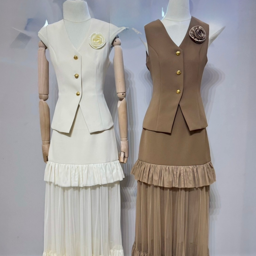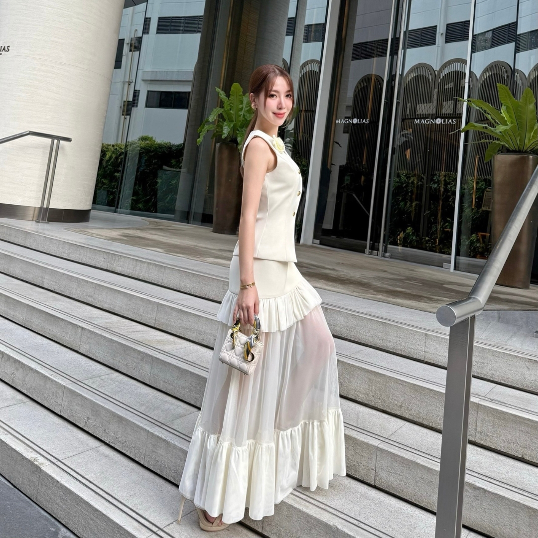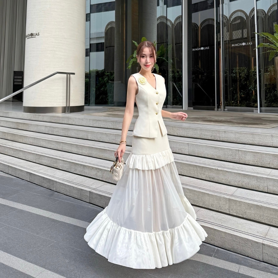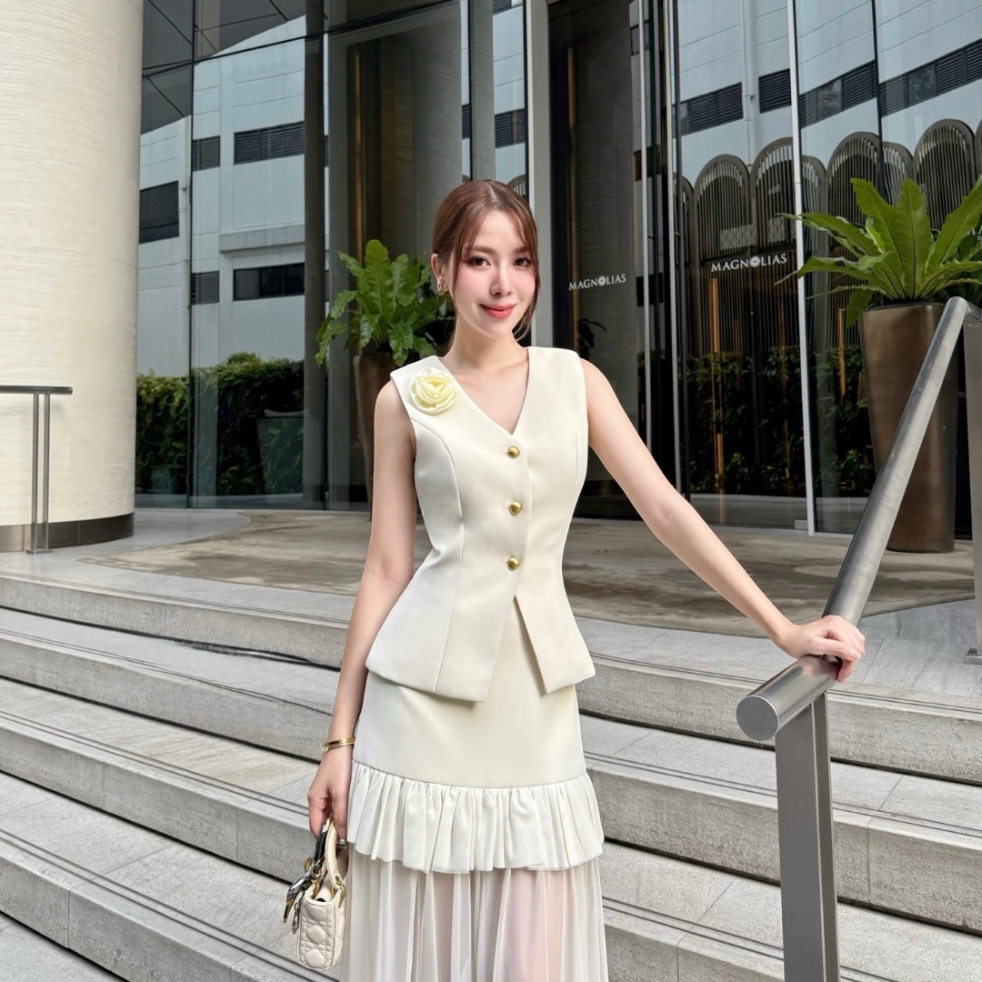 Grace meets sophistication in the Floral Layer Skirt Set, designed for the modern woman who embraces timeless style. The structured sleeveless top with gold button accents and floral brooch detail pairs beautifully with the soft, layered skirt — creating a fluid yet refined silhouette. Ideal for brunches, soirées, or elegant gatherings, this ensemble exudes understated luxury with every step.