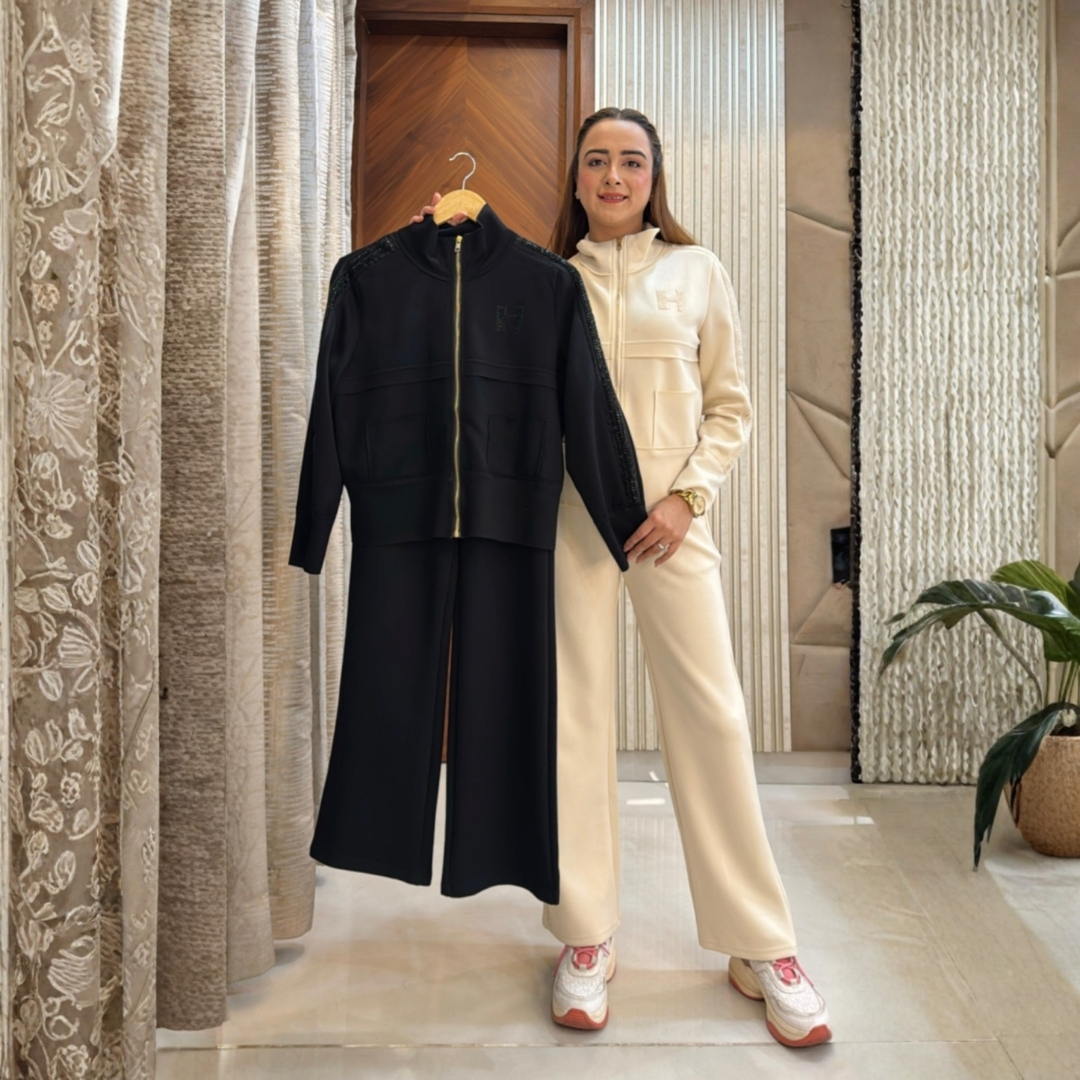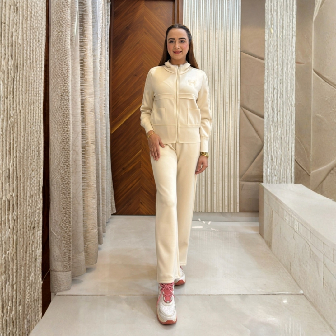 Redefine everyday elegance with the H Tracksuit, crafted for women who blend confidence with comfort. The soft ivory hue exudes sophistication, while the structured silhouette and minimal detailing make it a timeless wardrobe staple. Perfect for brunches, errands, or travel days — this set elevates simplicity into style.