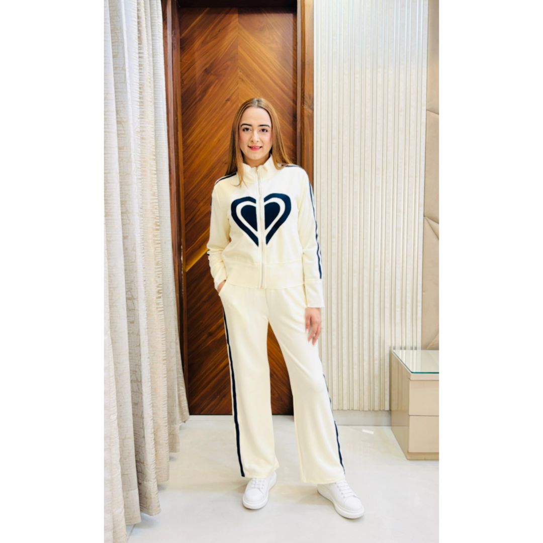 Step into effortless style and comfort with the Heart FS Tracksuit — a perfect fusion of elegance and sporty chic. Crafted from high-quality fabric with a flawless finish, this co-ord set is designed for women who want to feel confident, comfortable, and fashionable—whether lounging, running errands, or making a statement on the go.
