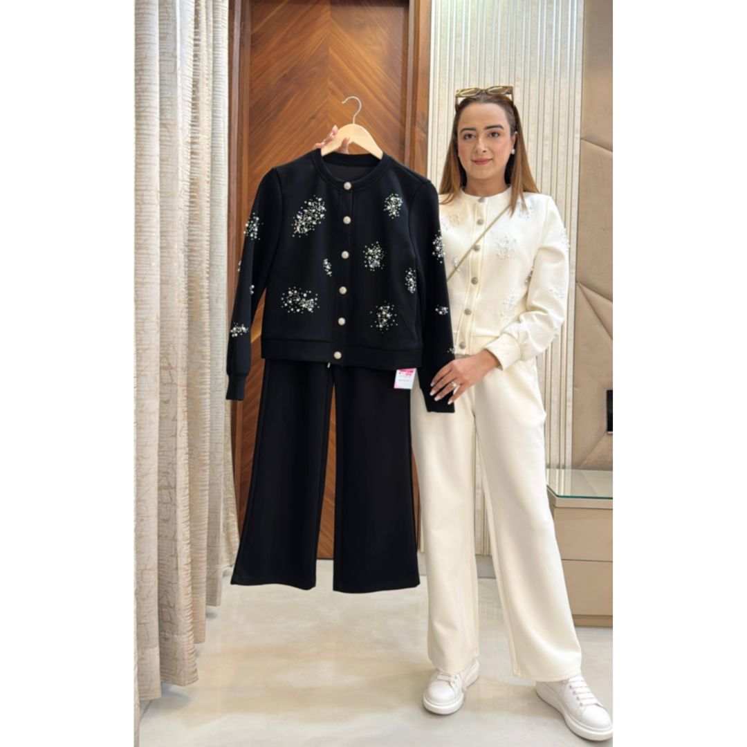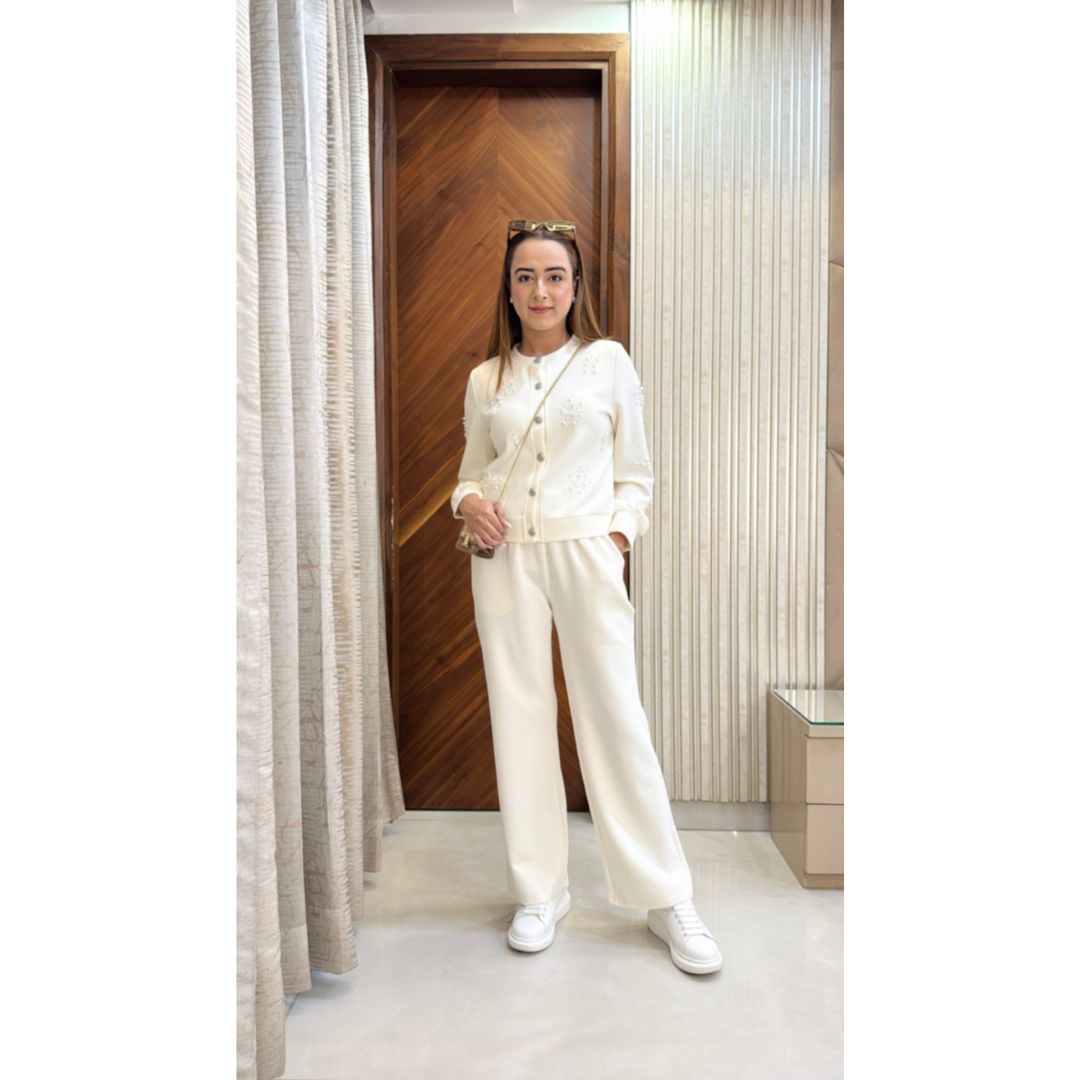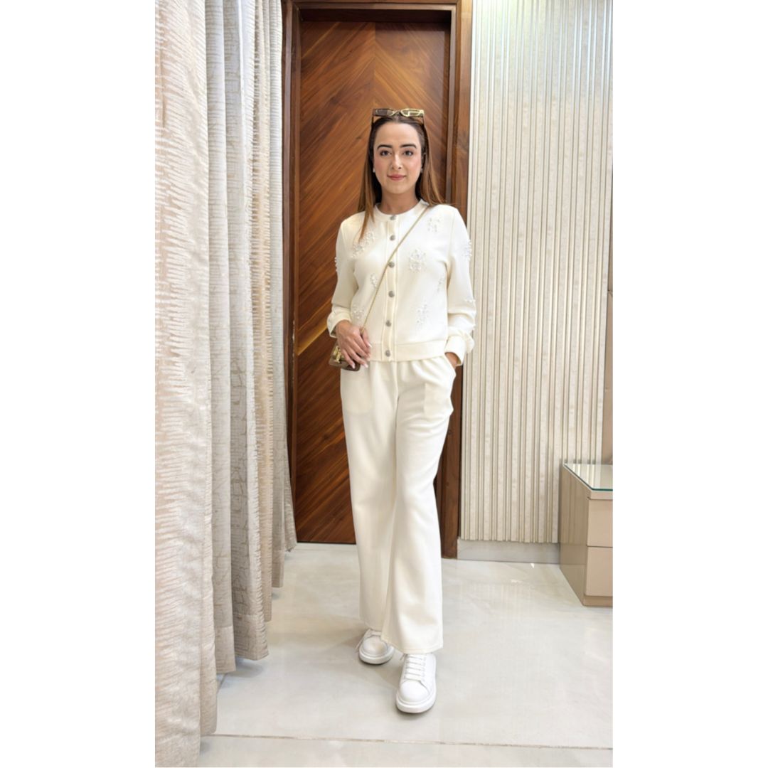 Grace meets glamour in the Pearl Tracksuit, a stunning blend of soft sophistication and subtle sparkle. Designed for women who prefer elegance even in casualwear, this ivory co-ord set is embellished with delicate pearl accents to elevate your everyday look.