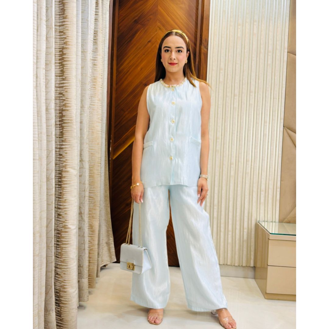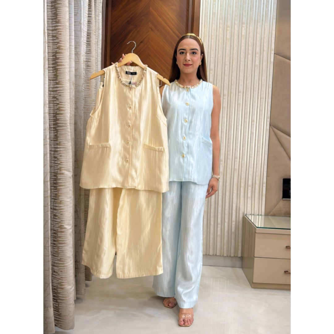 Embrace soft sophistication with the Shells Set, an airy co-ord inspired by breezy shores and serene elegance. Featuring a sleeveless button-down top adorned with shell-inspired buttons and wide-leg trousers in a delicate seafoam blue, this set is all about refined comfort.