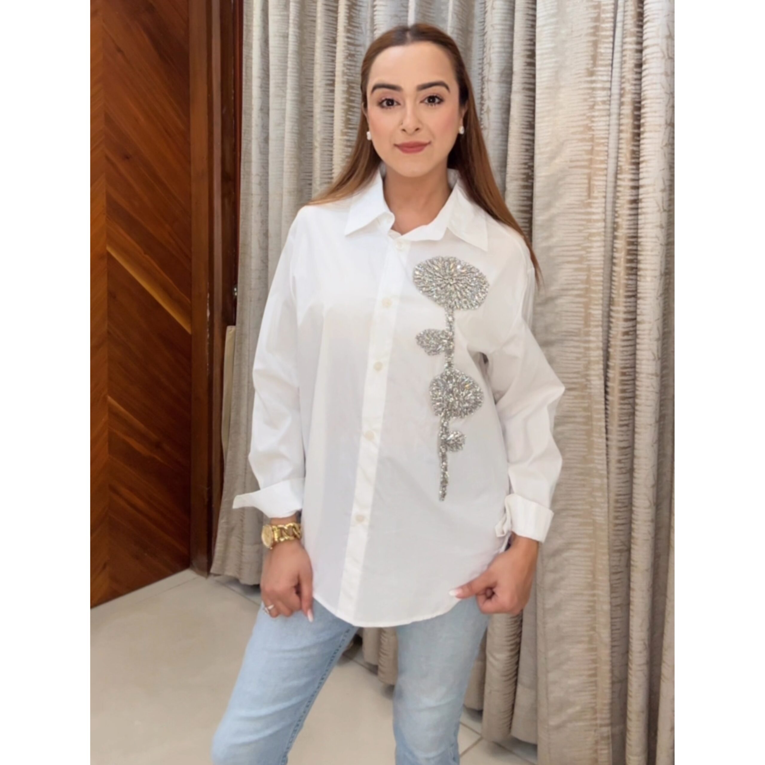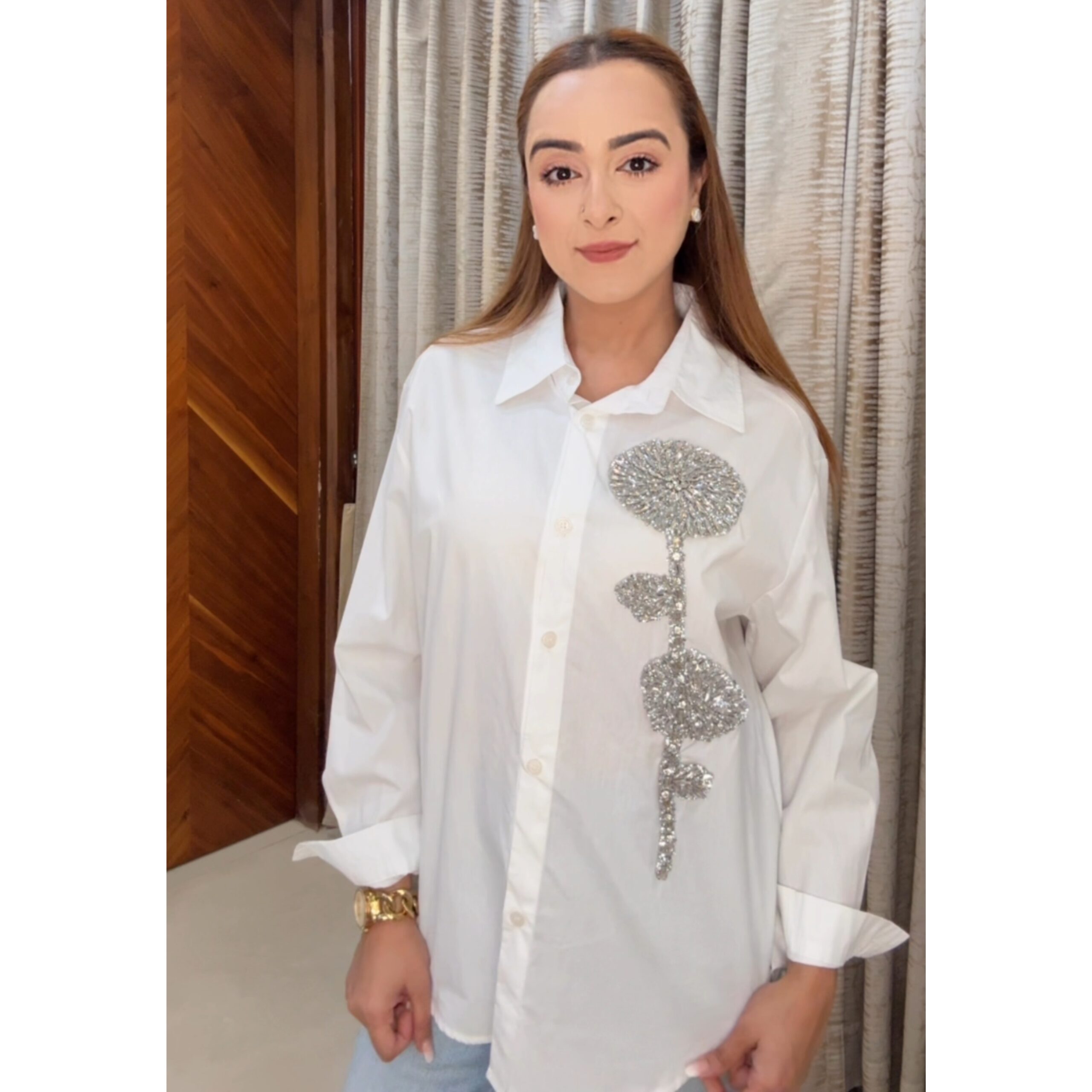 Elevate your everyday white shirt with the Stone Shirt, a beautiful fusion of simplicity and sparkle. This oversized button-down features an intricately hand-embellished floral motif in shimmering silver stones, designed to add glam to your casual wardrobe.
