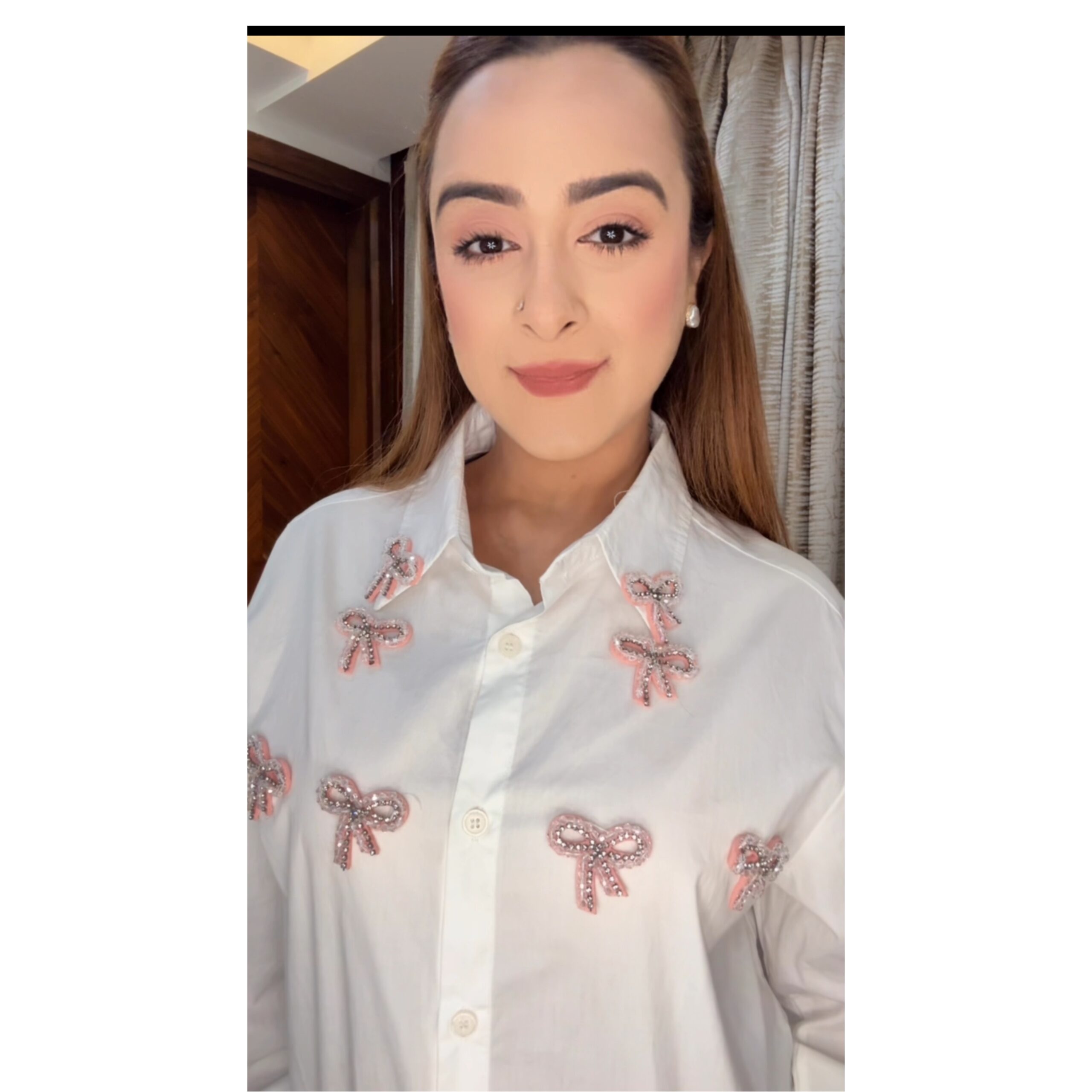 Elevate your everyday white shirt with the Stone Shirt, a beautiful fusion of simplicity and sparkle. This oversized button-down features an intricately hand-embellished floral motif in shimmering silver stones, designed to add glam to your casual wardrobe.